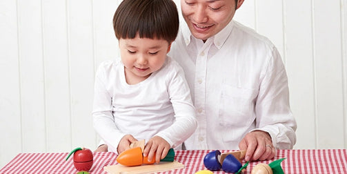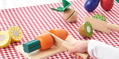 1人でごっこ遊びができない低年齢のお子様でも、包丁が2本あるので親子でまねっこ遊びから始められます。おままごと遊びを通して言葉やコミュニケーション能力を育んだり、野菜にも興味を持つきっかけになり食育にも繋がります。