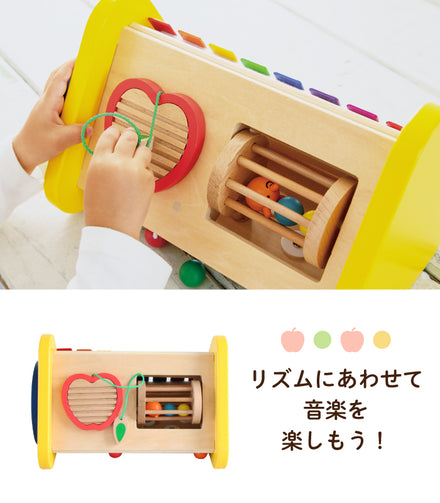 りんごの部分を葉っぱでこすれば音が鳴ります。 クルクル回転するラトルには、かわいい青虫くんとボールがカラカラと音を奏でます。