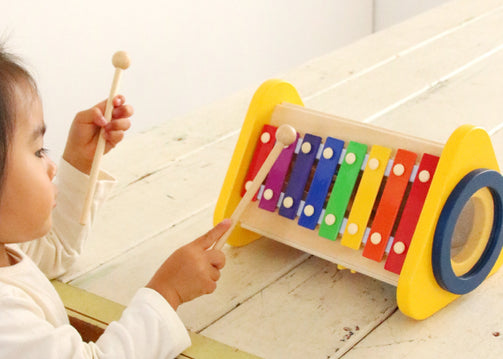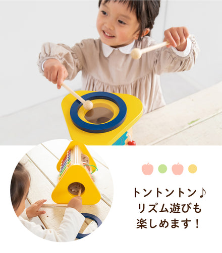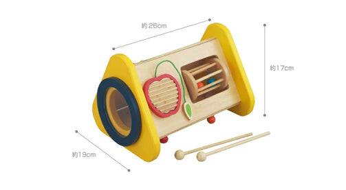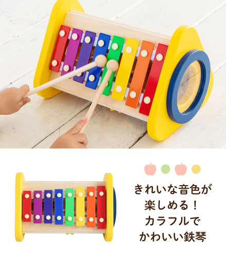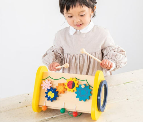ドラム・シロフォン・ギロ・ラトル・歯車の子どもが大好きな5つの音が楽しめるおもちゃです。 「たたく」「回す」「こする」という動作から音が出る楽しさを自分で発見し、音の違いも自然に理解していきます。音あそびを通して、音感を養い、情緒を豊かに育みます。さぁ、いろんな音を体いっぱい感じてみましょう。 5つのおもちゃがギュッと詰まった 音が楽しめるおもちゃ 5つの音が楽しめるおもちゃ どんな音が出るかな?いろいろな音を出してあそんでみよう!