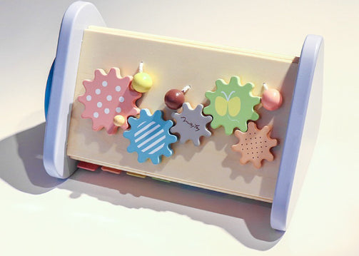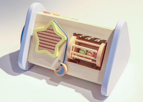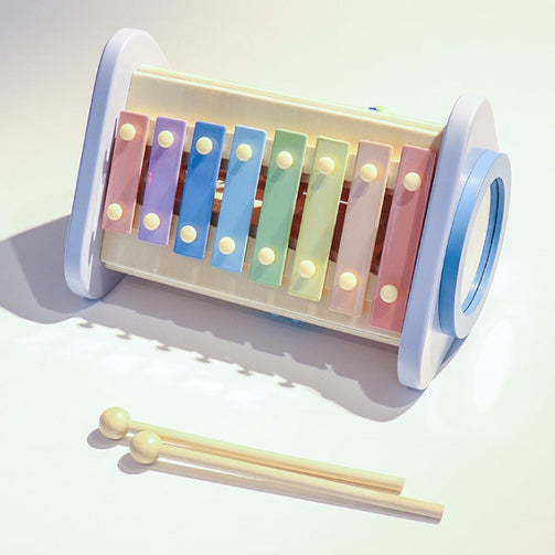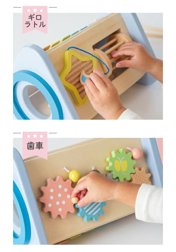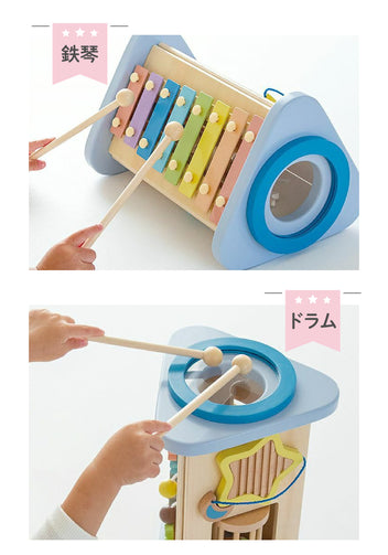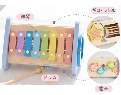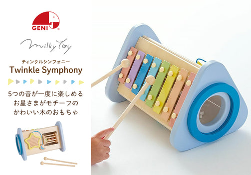 大きな可愛いお星さまをモチーフに、夜空をイメージしたおしゃれなカラーリング。鉄琴・ドラム・ギロ・ラトル・歯車などの色んな音あそびを通して、音感を優しく、情緒を豊かに育みます。鉄琴・ドラムを「たたく」、ラトル・歯車を「回す」、ギロを「こする」という動作から音が出る楽しさを自分で発見し、音の違いも自然に理解していきます。ミルキートイのポエムにあわせた優しいパステルカラーやお星さまのギロ、お月さまのピックが想像力を広げます。こちらは音を楽しむ “おもちゃ” です。楽器ではないため、調律はされておりません。