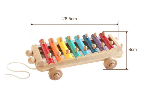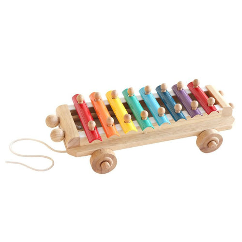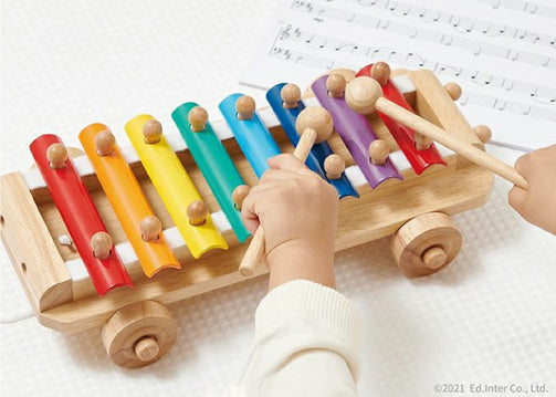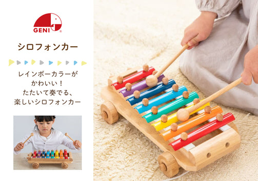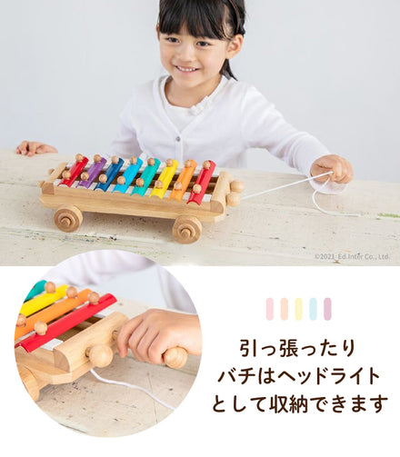 「ひっぱる」「たたく」「音を出す」ことで子どもの好奇心を満たす、 きれいな音色のシロフォン。 ひもを引いて プルトーイとして遊んだり、たたいて音色あそびを楽しんだりしましょう。スティックはヘッドライトのように収納することができます。