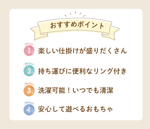 リングが付いているので、簡単にベビーカーやバッグに付けることが出来ます。外出先でも紛失する心配もなくお外でも楽しめます。