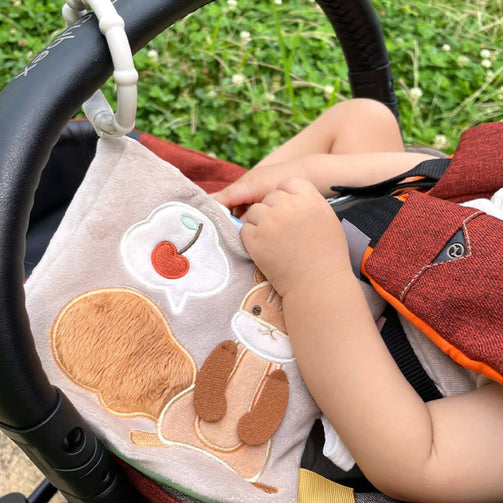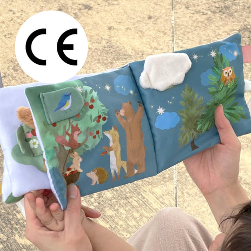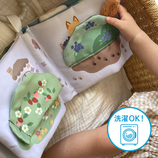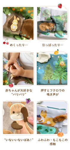 ページをめくって、カシャカシャ、きつねのしっぽや、雲はふわふわ、押すと笛がプップー! 見て、触って、鳴らして…赤ちゃんがよろこぶものを詰め込みました。