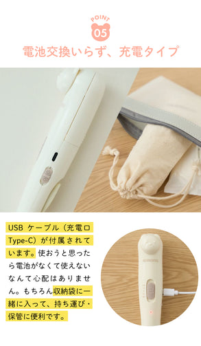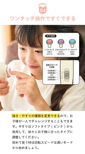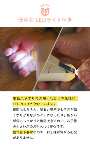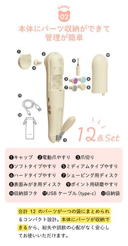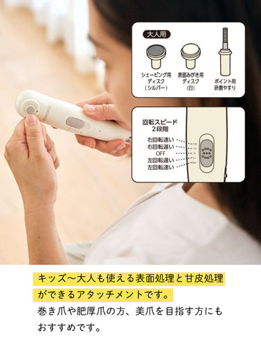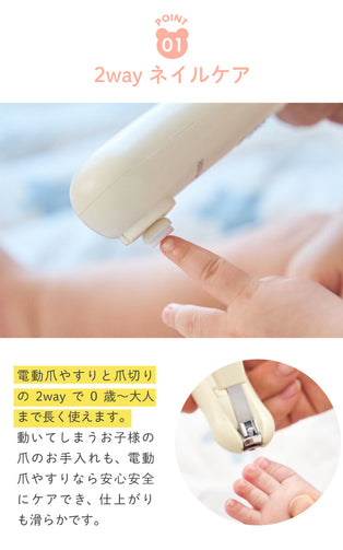 電動爪やすりと爪切りの2wayで0歳~大人まで長く使えます。 動いてしまうお子様の爪のお手入れも、電動爪やすりなら安心安全にケアでき、 仕上がりも滑らかです。