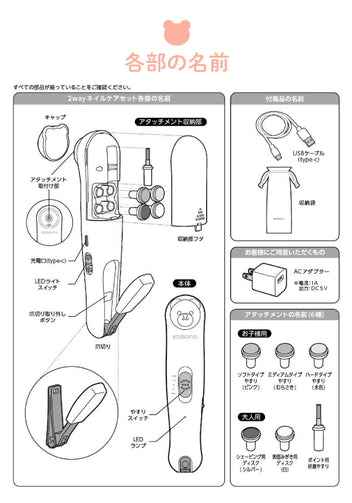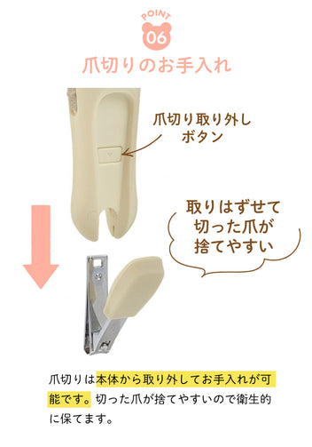素材 | 本体:ABS やすりアタッチメント:ABS、EVA+ホワイトコランダムパウダー(白色研磨剤) 爪切り:ステンレス、シリコン |
