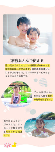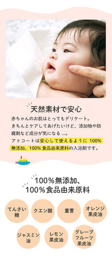 100%無添加、100%食品原料由来成分。安心して使える理由がたくさん。 赤ちゃんのデリケートな肌を「てんさい糖」のチカラでしっかり保湿。 乾燥しがちなプール遊びでも使用できる優れもの。 追い焚きOKなので家族みんなで使えます。