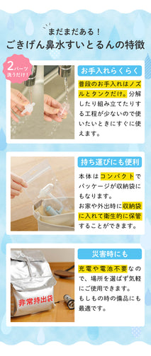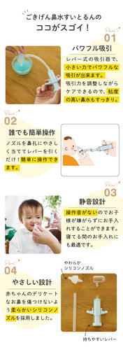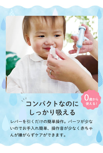 お鼻が小さく、少しの鼻水で鼻づまりをしてしまう赤ちゃん。お鼻が詰まっている状態は、赤ちゃんも不機嫌となり、寝つきも悪くなってママ・パパも心配になります。そこで、重要視されている“パワフルな吸引力”の真空ポンプ式をベースに、新たな形の鼻水吸引器を開発しました。 従来の真空ポンプ式は、ポンプの大きさが目立つものが主流ですが、持ち運びやすいコンパクトさと、操作性の高さを目指した進化モデルが誕生です。 今回の「ごきげん鼻水すいとるん」は、手軽に、家族みんなで快適に過ごせるよう、育児の必需品の1つとして新たに提案したい鼻水吸引器となりました。
