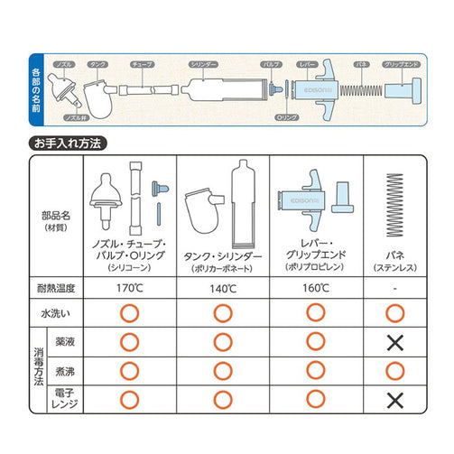 素材 | ポリプロピレン、ポリカーボネート、シリコーンゴム、ステンレス |