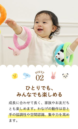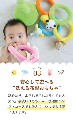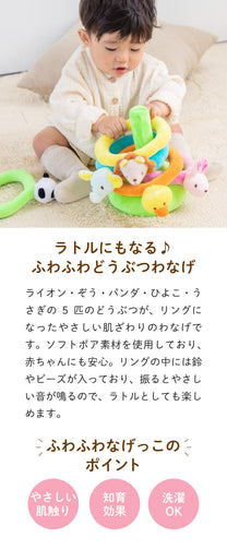 赤ちゃんの「やってみたい!」を引き出す、ふわふわおもちゃ。 にぎる、ふる、なげる…。 赤ちゃんの好奇心に寄り添いながら、 手指の運動や聴覚・空間認識力を自然に育てます。 リングの中にはビーズや鈴が入っていて、 振るたびにやさしい音が。 音の鳴る方向に反応することで、聴覚や集中力も養われます。 「遊びながら学ぶ」がぎゅっと詰まった、 赤ちゃんのための知育トイです。