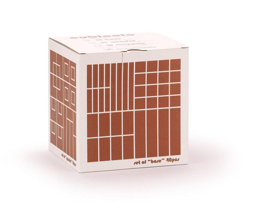 base(ベース)セットは、横に並べたり、上に積むという「CUBICOLO」の一番基本となるセットで、 5種類の形のものが合わせて40ピース入っています。平面に秩序良くきれいに並べる、 高く積む、崩すという基本造形が自由自在に楽しめます。