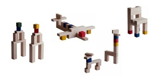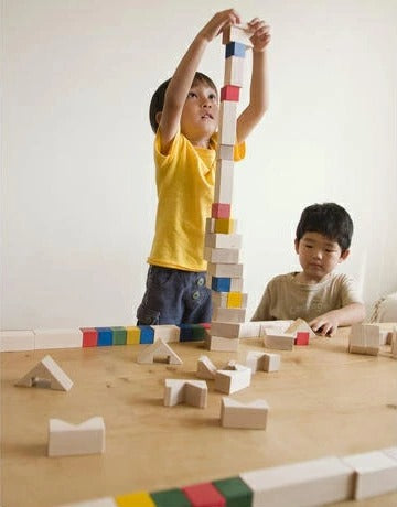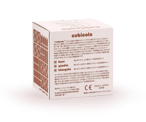 “cubicolo” は3cm基尺の積み木シリーズです。積むだけでなく、はめたり、組んだり、 構成したりと創造力の幅を広げることが出来るように設計されています。 base(ベース)は5種類の大きさを組み合わせた全40ピースの基本造形セット。赤/青/黄/緑の色のついたピースもあるのでアクセントとして色彩構成も楽しめます。