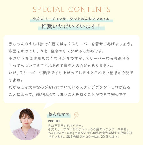 お股ボタン付きで、寝返りをしてもはだけず、めくり上がらないため、寝相の悪いお子さまの寝冷え防止におすすめです。成長後はボタンを外して使えるロングユース設計です。