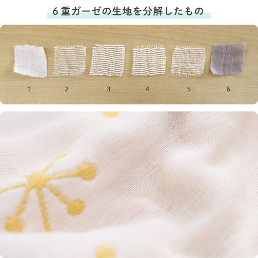 密度の異なるガーゼを6層に織り上げることで、空気の層を生み出し、夏はさらり・冬はあたたか。1年中快適に使えます。お子さまは大人の2〜3倍の汗をかきます。6重ガーゼは余分な熱を逃しつつ、汗をすぐに乾かして快適さをキープ。 日本の職人技が生きる、こだわりの生地です。
