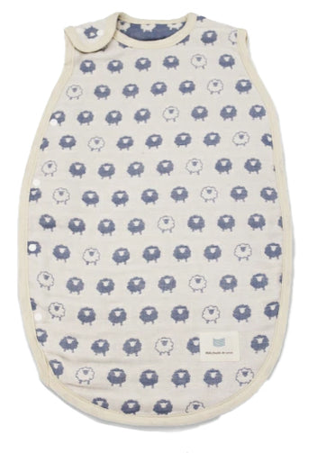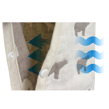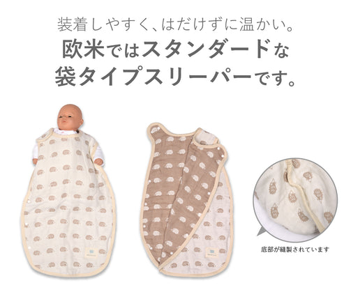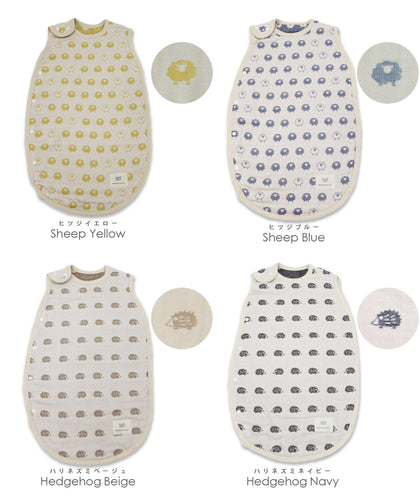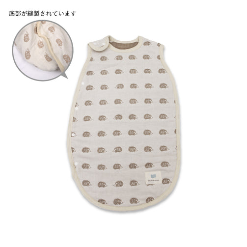 お子様をやさしく包む、肌触りのやさしい6重ガーゼスリーパーです。赤ちゃんの肌に触れるものだから、日本製の生地、日本国内の縫製に徹底的にこだわりました。6重ガーゼは、”夏はさらりと、冬はあったか”な年中快適素材です。洗うほど柔らかく、空気を含んでふわふわになります。空気が通るので乾くのが早いのも嬉しい特徴です。スナップボタンで着脱もスムーズです。※底部が縫製されている袋タイプとなります。