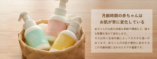 泡切れ、すすぎ落ちに優れ、すすぎ後のお肌にヌルつきが残らず、さっぱり洗えて入浴後のお肌はしっとり。赤ちゃんの臭覚が未熟なのであえて“無香性”。
