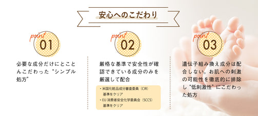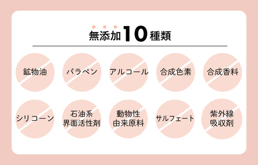 お肌に負担のかかる可能性のある成分を排除し、本当に必要な、安全性の高い成分のみ採用しました。※パッチテスト・スティンギングテスト済み