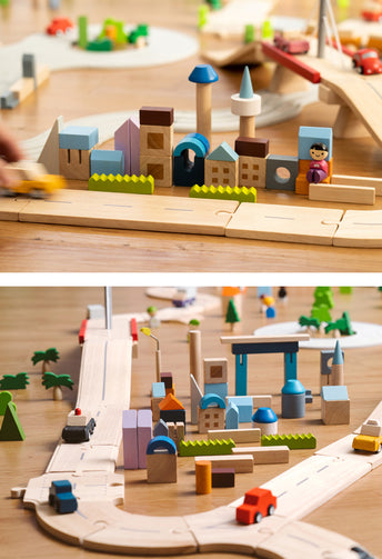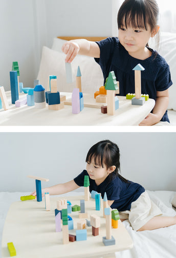 街をつくって物語を考えたり、お手持ちの乗り物や人形を動かして遊ぶことで、想像力を豊かにしたり、色んな形のパーツを組み合わせて積み上げることで、バランス感覚や集中力が身につきます。ブロック遊びは手指をよく使うので、手先の発達にもつながります。手先が発達することでお箸や鉛筆、ハサミなど練習にもなります。※シティブロック以外のおもちゃは付属しておりません。