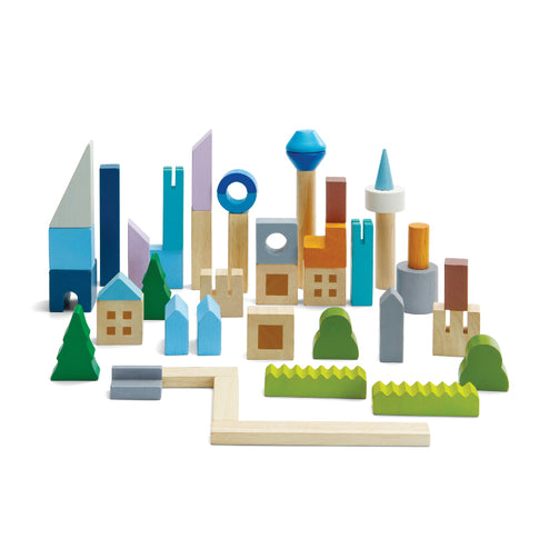 やさしいパステルカラーのブロックのセットです。街路樹やアーチを含めた45個のユニークな形のブロックは積み木として遊ぶことはもちろん、お手持ちの人形や乗り物、木のレールなど組み合わせて自分だけの街づくりを楽しめます。