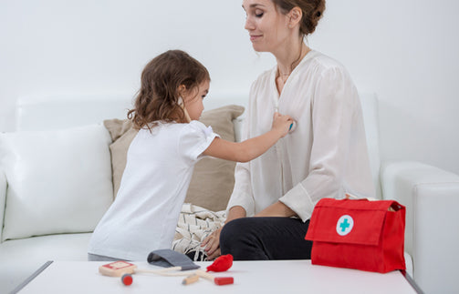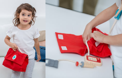 お医者さんになって、お友達を診察してあげましょう。幼い時期から他人を思いやる気持ちや、共感する心を養います。基本的な医療器具5種が持ち運びできるドクターケースのセットです。