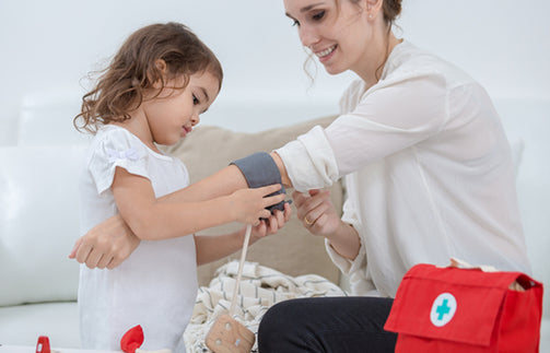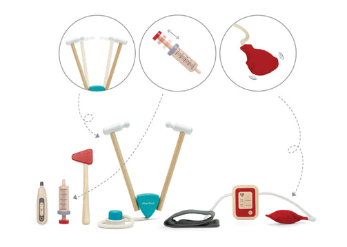 温かみがある木製のドクターセットは、聴診器・注射器・体温計・血圧計・ハンマーの基本的なセットが5点入っています。血圧計の送気球は押すとピコピコとかわいい音が鳴る仕掛けで小さなお子様でも楽しめます。お医者さん役や患者さん役を通して、相手を思いやる気持ちや、コミュニケーション能力が身についたり、注射器を押したり、血圧計等で遊ぶことで手指を上手く使う練習にもなります。