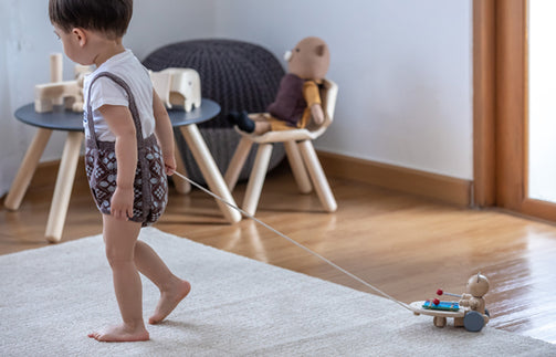 ひもを引っ張るとかわいいクマさんがシロフォンをたたきながら付いてきます。ひもを横に引っ張ると別の鍵盤をたたき、歩く楽しさ、リズムを刻む楽しさに気付かせてくれるプルトイです。また、「紐を引っ張ればおもちゃが動く」という関連性や、引っ張って歩くことにより体のバランス感覚を養えたり、引っ張る動きを繰り返すうちに、指先や腕力の発達など様々な成長をサポートします。お子様がなめても安全な塗料、ゴムの木をリサイクルした廃材で作られています。