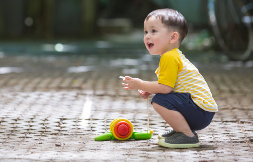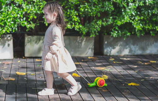 かたつむりの形にデザインされたプルトイ。急な反転もでき、お子様の動きにしっかりついて行きます。 「紐を引っ張ればおもちゃが動く」という関連性や、引っ張って歩くことにより体のバランス感覚を養えたり、引っ張る動きを繰り返すうちに、指先や腕力の発達など様々な成長をサポートします。お子様がなめても安全な塗料、ゴムの木をリサイクルした廃材で作られています。
