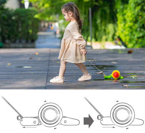 ひもを引っぱると、かたつむりが体を上下にさせながら進みます。お子様の動きに合わせて、反転します。