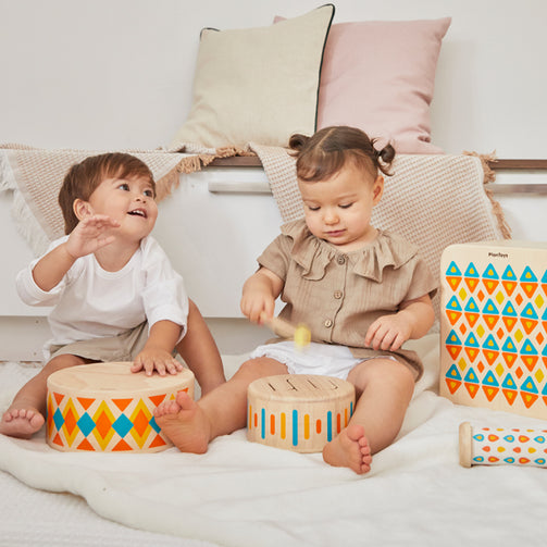 プラントイのドラムは手やゴム製ヘッドバチでたたくと、木の柔らかな音とリズムが響きます。他の楽器とセッションしてバンドを組んでみよう!微細運動能力や手の目の協調性を養うとともにコミュニケーション力も養います。