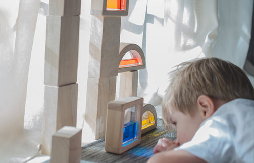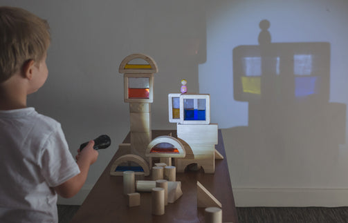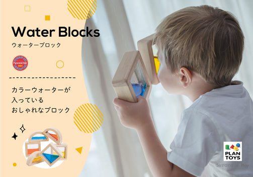 ブロックを動かしながら、色水の動きや音の変化を発見したり、太陽の光やライトを照らして、光が反射した美しい影を楽しむことができます。また、お手持ちの積み木やお人形と組み合わせてごっこ遊びも楽しめます。