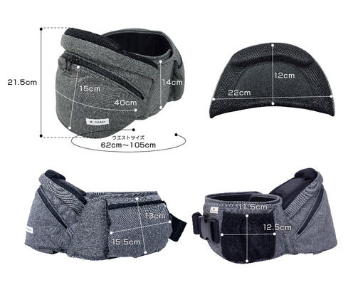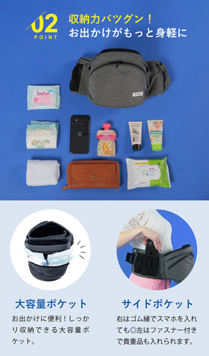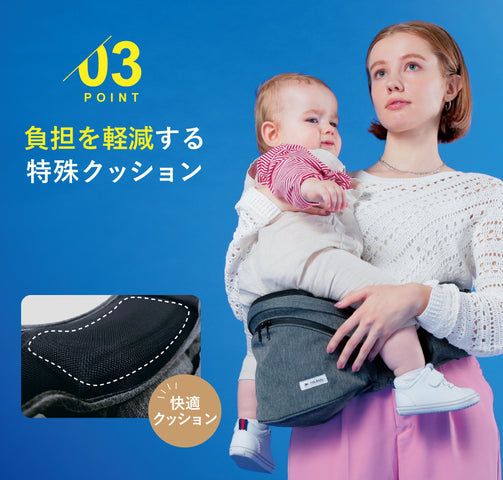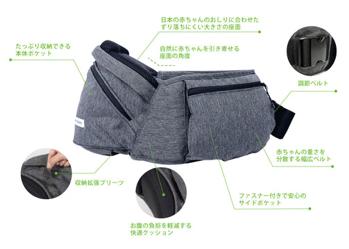 赤ちゃんが自然とママ・パパに寄り添える台座角度と抱っこが安定するストッパー&滑り止めシート、パパ・ママの負担を軽減する幅広腰ベルトや腹部のクッションで長時間の抱っこや赤ちゃんが大きくなっても安定した抱っこを実現。 ショルダーパーツ(別売り)もさっと収納できる大容量のポケットは、ちょっとしたお出かけならこれ1つでOK!肩に負担なく、誰でもかんたんに使える、ヒップシートです。