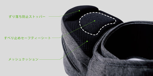 摩擦性の高い「すべり止めセーフティシート」で、抱っこがさらに安定!座面の先端には、立ち上がったクッション「ずり落ち防止ストッパー」が付いているから、安心です。直接赤ちゃんの肌に触れることが多い外側には、柔らかい「メッシュクッション」を採用しています。