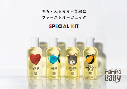 赤ちゃんの誕生や子どもたちの Anniversaryを祝う GIFTやトライアル、またTRAVELにぴったりのキット。 オーガニック&ヴィーガンブランド MammaBaby のスター製品、11の無添加のベビーソープ、ボディソープ、シャンプー、ベビーオイルの4本入り。 新パッケージは環境に配慮した紙製「生分解性パルプモールド」を採用しています。