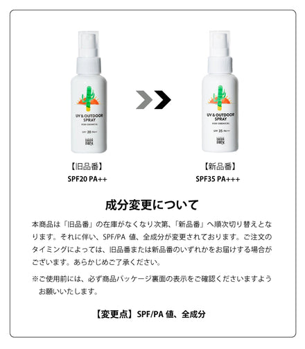 使用方法 | ご使用前に本体をよく振って、肌から10〜20cmほど離してご使用ください。 日焼け止め効果・アウトドアスプレー効果を保つため、2〜3時間に一度の塗りなおしをおすすめしています。また、汗をかいた時や、タオルで肌を拭いた時は、必要に応じて塗りなおしてください。 ご使用後はお湯で洗い流せます。 |