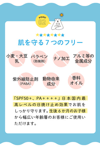 配合成分 | 水、オクトクリレン、ホモサレート、ミツロウ、サリチル酸エチルヘキシル、t-ブチルメトキシジベンゾイルメタン、セチルジメチコン、安息香酸アルキル(C12-15)、ココグリセリル、PEG-15コカミン、ヘキサデセン、ステアリン酸PEG-40、(アクリレーツ/アクリル酸アルキル(C10-30)クロスポリマー、TEA、フェノキシエタノール、カプリリルグリコール、グリセリン、カプリルヒドロキサム酸、EDTA-2Na、BHT、パンテノール、パントラクトン |