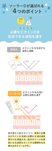 ビタミンDを皮膚上で生成させるためには紫外線B波が必要です。従来の日焼け止めではA波もB波も防御しますが、ソーラーDはB波の一部の波長だけを通すことを可能にしました。B波の波長帯のうちビタミンD生成可能な約290~310 nmの波長だけを通過させ、有害な約315~380 nmの波長を効果的にフィルタリングします。太陽の光による日焼けから肌を守り、太陽の光によって体がビタミンDを作ることを妨げない、世界初の日焼け止めクリームです。