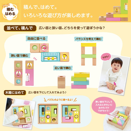 積み木を積むことで手先の器用さやバランス力や集中力を高めます。また、積めたことで自信につながり挑戦する気持ちや好奇心を育みます。パズル感覚で木箱に入れてみたり、遊びながらお片付けの練習もできます。