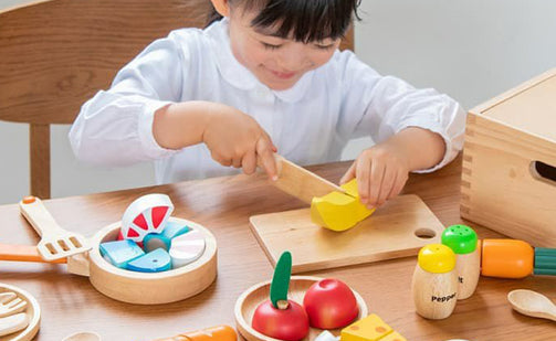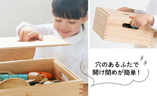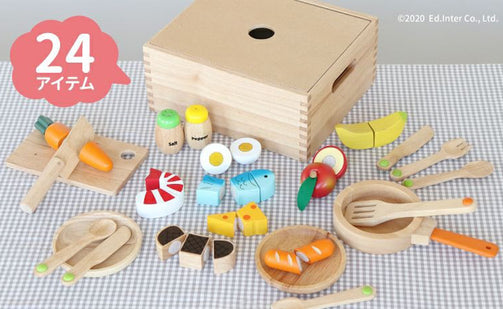 The ingredients come with a hook-and-loop fastener that creates a satisfying crunching sound and satisfying texture when cut with a knife. You can enjoy the sense of accomplishment of cutting properly, so you can play with it again and again. In addition, all the play food can be disinfected with alcohol. You can play safely and cleanly. The wooden box is large and has a lid. All the play food in the set can be stored neatly. The wooden box has a handle, so it is easy to carry! It is easy to clean up and move. The package is also gift-wrapped with illustrations of a gentle texture. This one set is perfect for celebrations and gifts because you can play with it thoroughly.