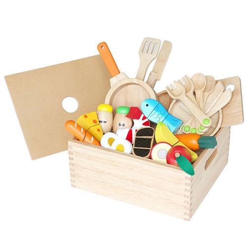 Accessory set | Wooden box (with lid), frying pan, spatula, 2 plates, 2 forks, 2 knives, 2 spoons, cutting board, knife, steak, fish, sausages, shrimp, salt, pepper, apple, banana, cheese, boiled egg, carrot |