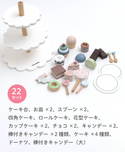 A voluminous 22-piece set! A complete dessert set that you can play with as soon as it arrives. It comes with cute cakes, candies, plates, and spoons, so you can enjoy authentic pretend play.
