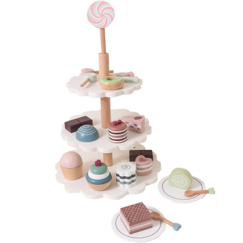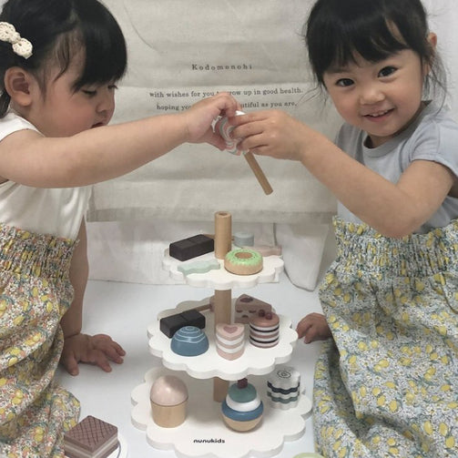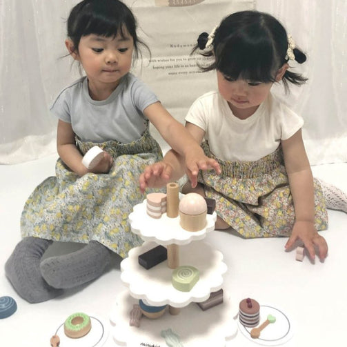 "Let's enjoy a special afternoon tea♪" This is a cute dessert tower play set with warm wood and muted colors. The cake stand has three tiers, and when you place a wide variety of cakes and sweets on it, you can create a gorgeous dessert tower. There is also a "tea set" from the same series, so playing together is sure to liven up the party! Recommended for birthday photos and as a gift.