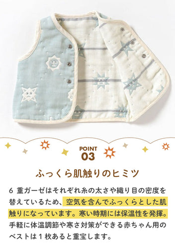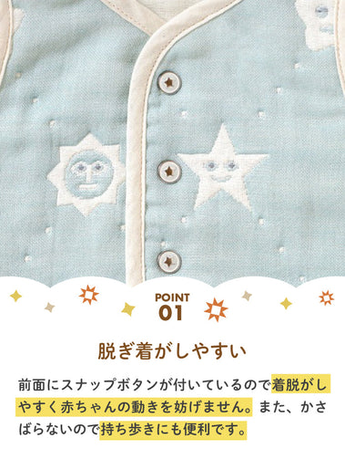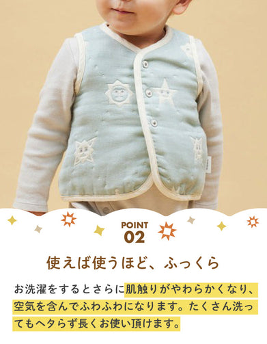 Everyone is a shining star. Every newborn baby has their own personality and is different. We designed each baby with a different star, likening each unique baby to a star. The 100% cotton 6-ply gauze is soft, breathable, and warm. For babies who are not yet good at regulating their body temperature, a baby vest that can easily regulate body temperature and protect against the cold is a useful item.