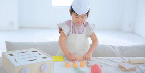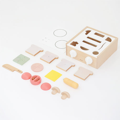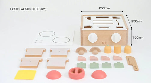 A typical child's game is playing house. By playing while acting out roles, children can develop communication skills, expressiveness and language skills. By cutting vegetables and pretending to cook, children can also develop dexterity. A very fun game that develops children's brains and minds. To make playing house even more fun, we have prepared children's favorite foods. Bread, ham, cheese, tomatoes, lettuce, mushrooms and carrots. Tomatoes are made into bells and lettuce into puzzles. It also has a spice of fun. When you remove the stove plate, a shape-fitting plate appears. Cut the ingredients, stick them together, and carefully consider the shape to put them in the holes. This toy can be enjoyed as a shape-fitting game that develops a sense of shapes while playing and enhances creativity.