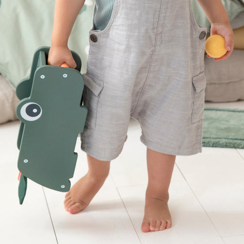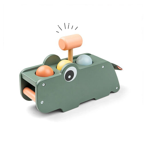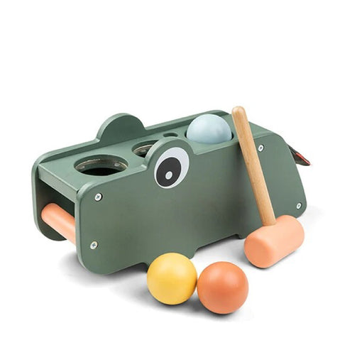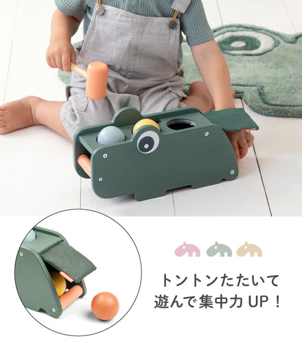 クロコの背中の3色ボールをハンマーで叩いて中に落とす木製トイ。赤ちゃんが色に興味をもち始めたら色当てやギブ・アンド・テイクをゲーム感覚で。手先が器用になってきたらハンマーの扱いやお片付けのトレーニングに。