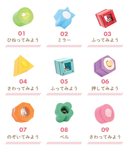 ひねる、のぞく、音を鳴らす、てざわりをたのしむ、 子どもの好奇心を刺激するアクティビティがいっぱい! 付属のトレイはお片付けをしながら色や形の認識を促します。
