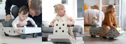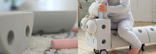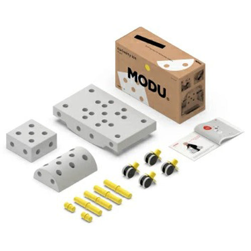 MODUは、頑丈で肌触りが柔らかいEVAフォームで作られているので安全性が高く、少々荒く扱っても大丈夫。室内でも思いっきり遊ぶことが出来ます。また、各キットに付属する小さい車輪の接地部はポリウレタン樹脂で出来ているため、キット全体を通して部屋が傷つきにくい仕様になっています。
