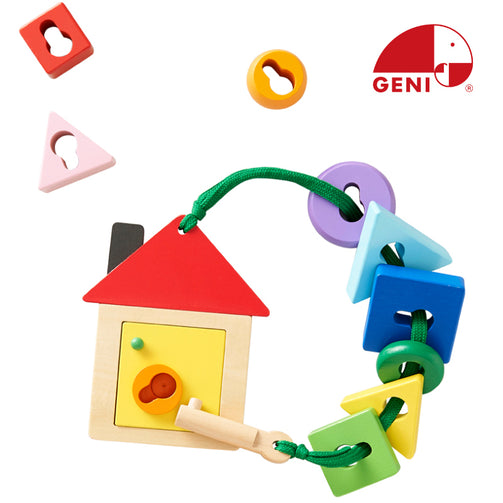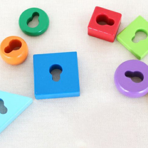カラフルでいろんな形や大きさのブロックにカギを通してみよう! 家のカギ穴は、回すとカチカチ音がして、扉を開閉できます。