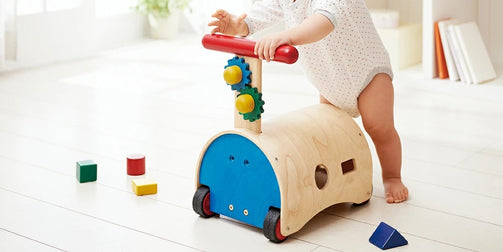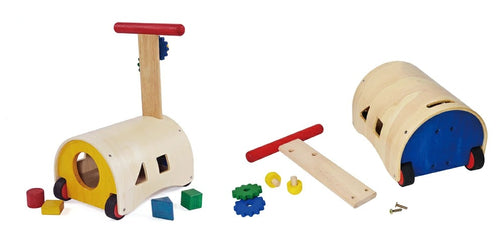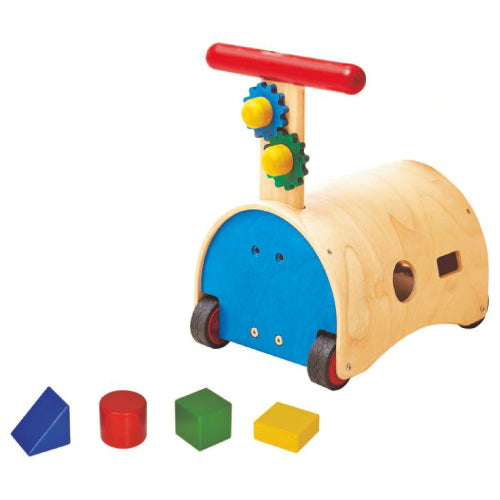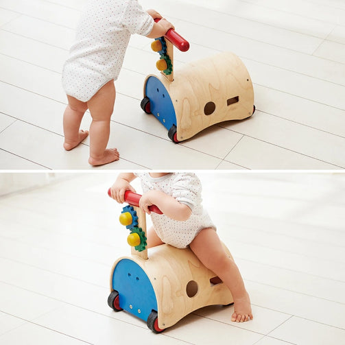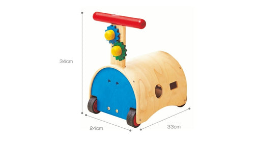 ハンドルの高さを2段階調節し、手押しとしても、乗用としても使える玩具です。本体には型はめブロックやギア・木ねじもついていて、いろんな遊びが楽しめます。