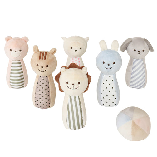 表情豊かなかわいい動物たち。 ボールを転がして動物さんのピンを倒すと、中の鈴が優しく鳴ります♪ ふわふわと優しい素材と柔らかな色彩の布おもちゃなので、ご出産祝いやファーストトイにぴったりです。