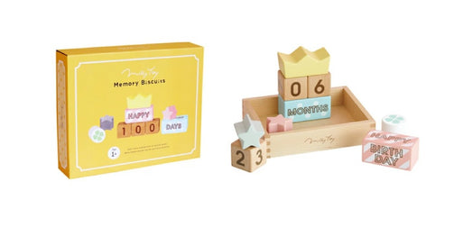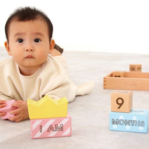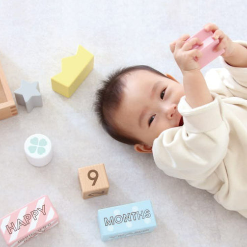 ハッピーモチーフのブロックとやさしい色合いはご出産祝いのギフトにぴったりです。