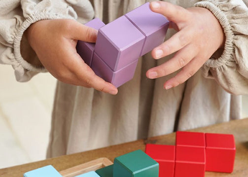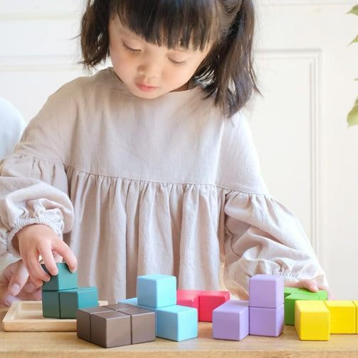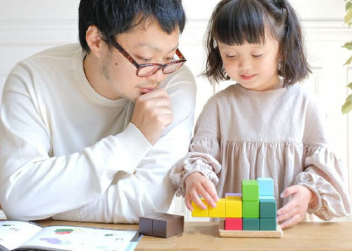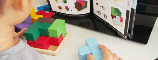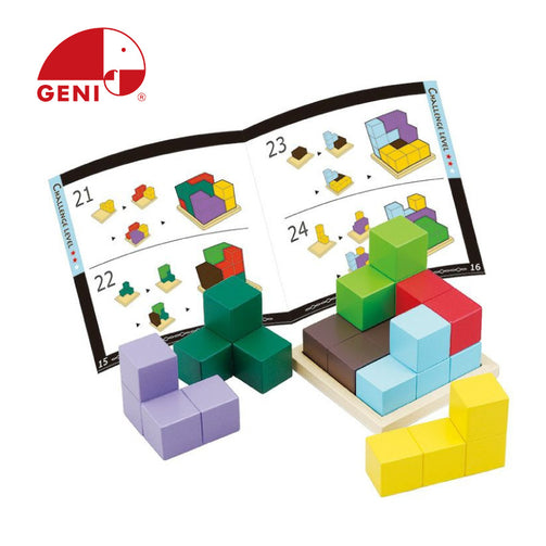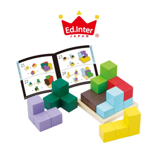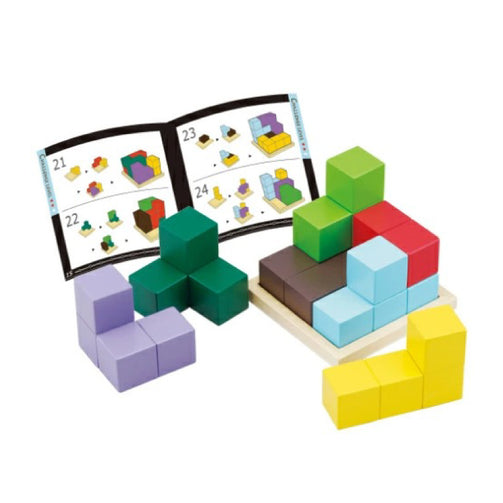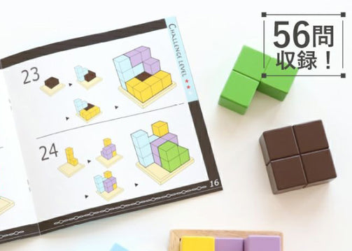 カラフルな7つのブロックで木製プレートの上に立方体を組み立てます。 56種類の作品例を掲載したテキストッブックを参考に、柔軟に頭を使いましょう。 上級レベルは大人でも頭を抱えるほど難易度が高く、夢中で遊ぶうちに脳が活性化されます。 立方体が完成したときの満足感が繰り返し遊ぶ意欲を引出し、忍耐力と集中力を養います。